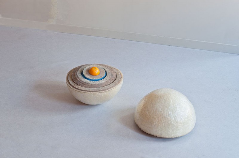 Mon, orange entourée de ruban adhésif de différentes couleurs formant une sphère de 47 cm de diamètre, coupée en deux.